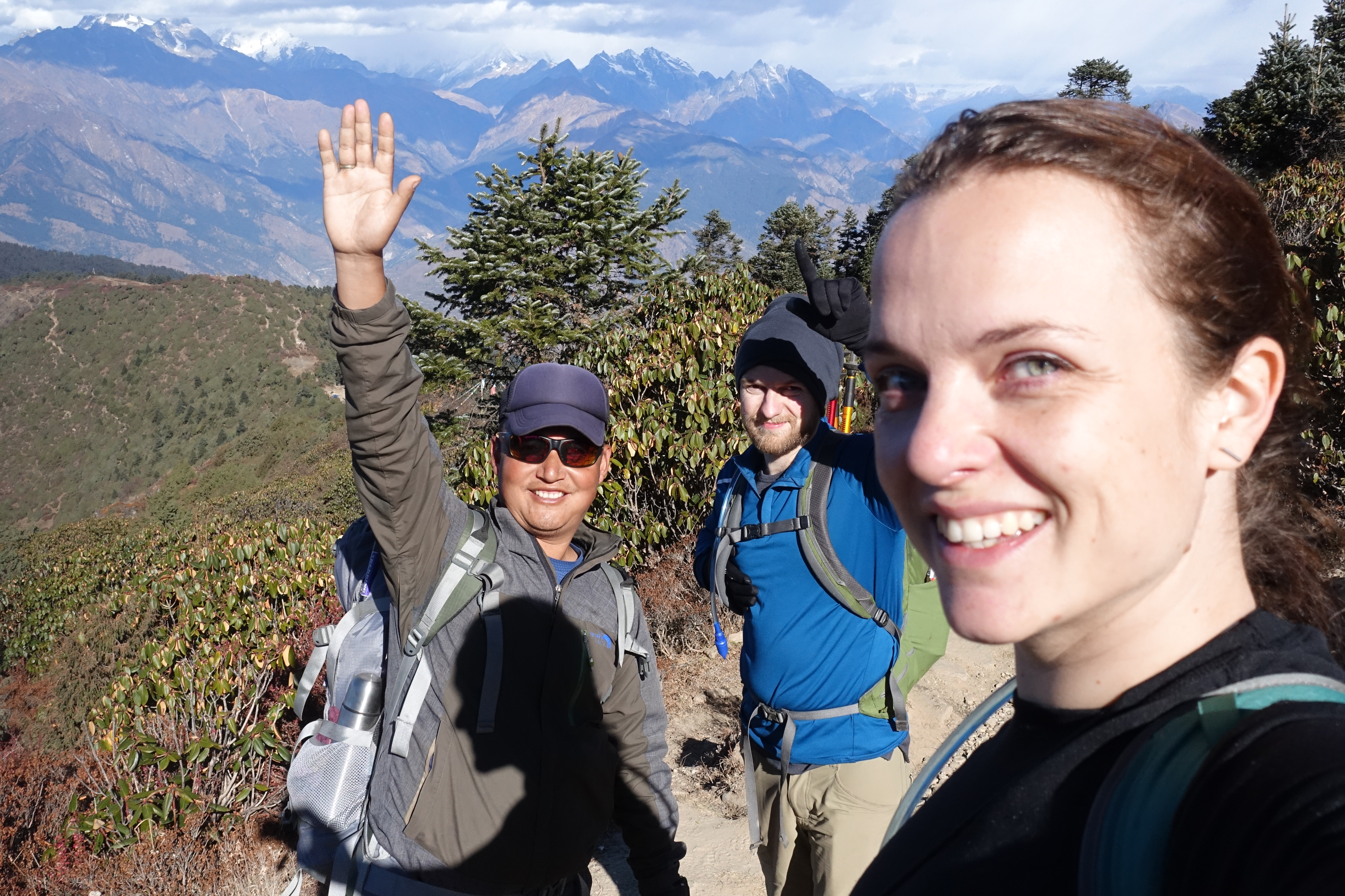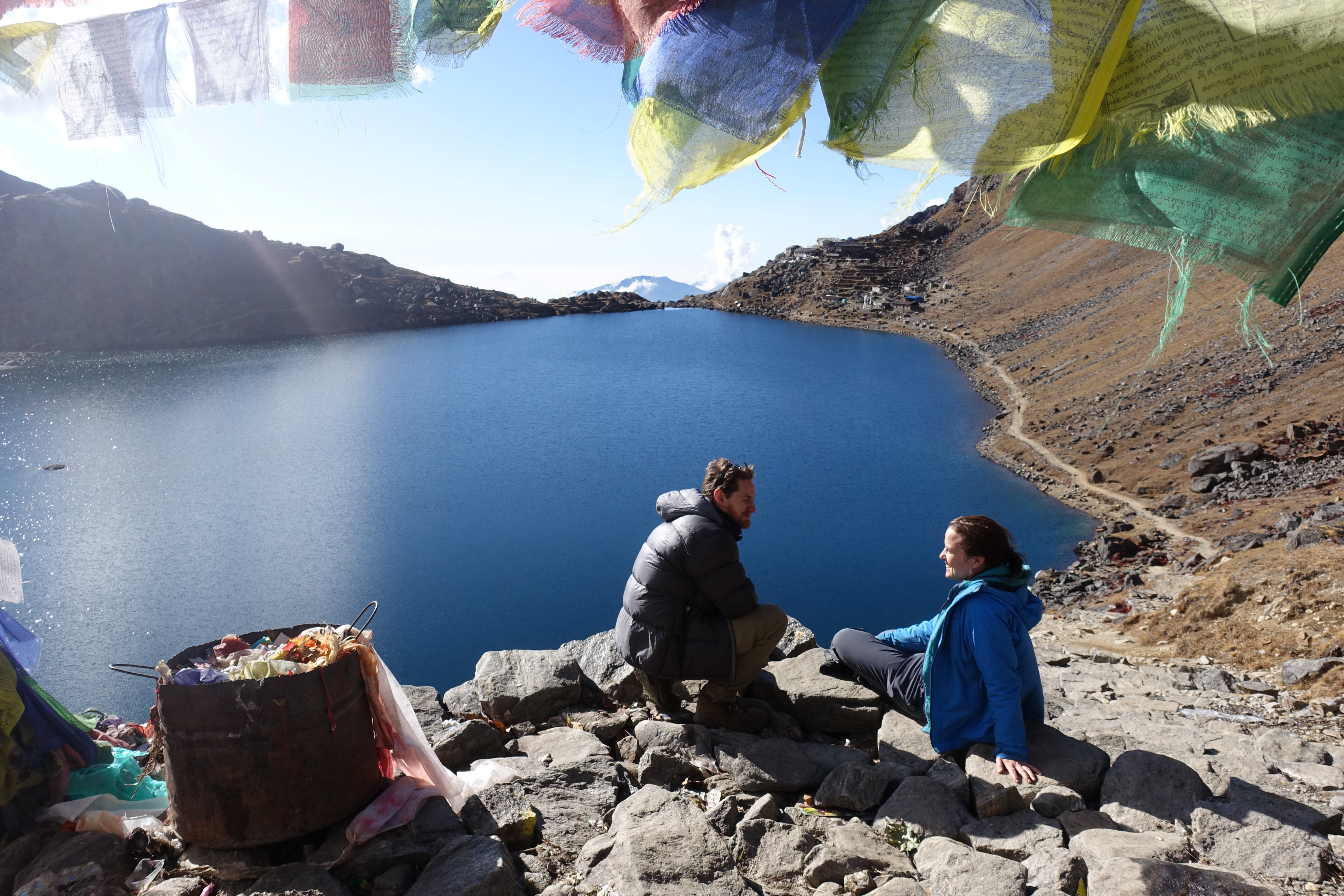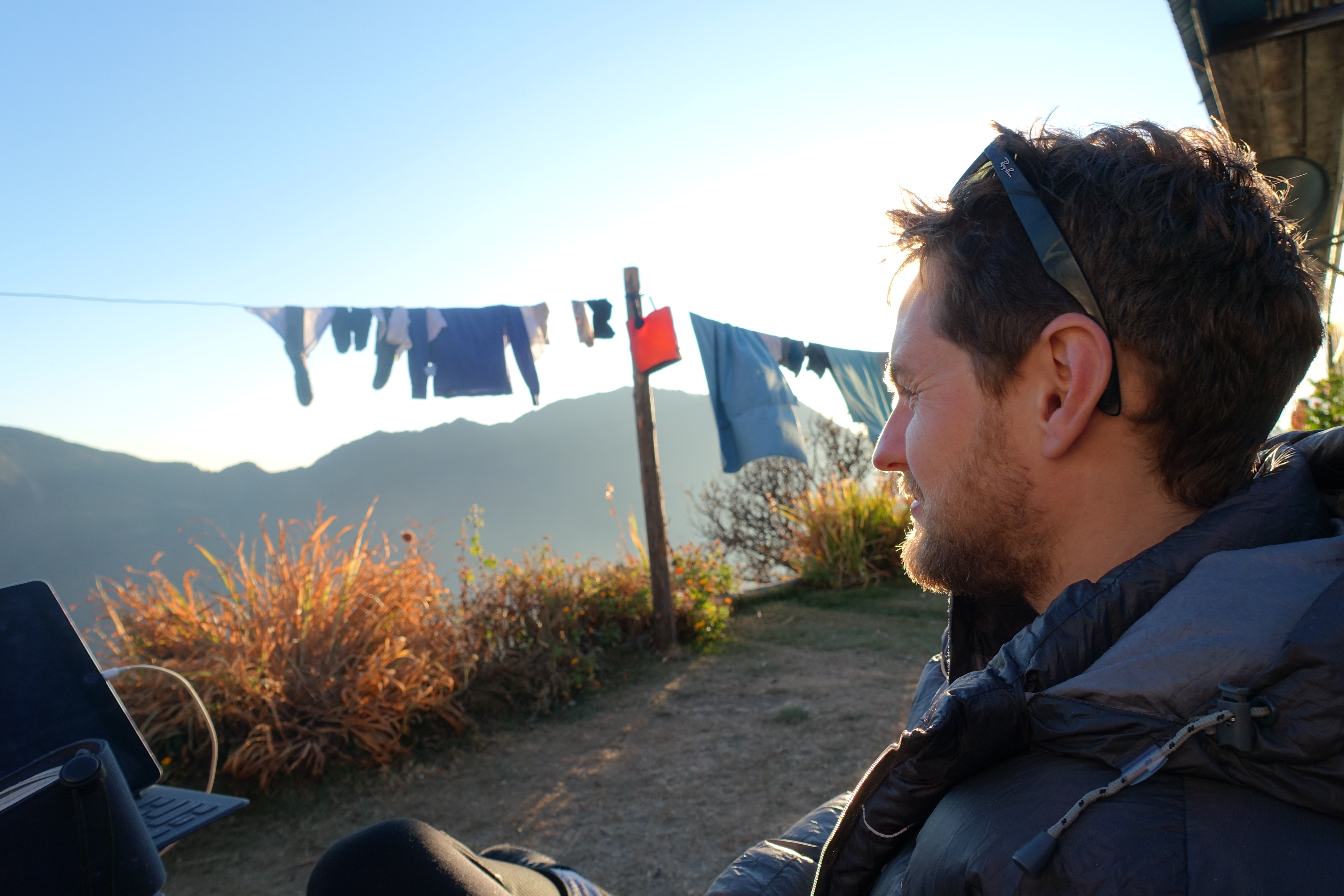 The trek contains gradual climbs and descends, with some parts steeper than others. The sights are unbelievable, and you cross interesting people and different village cultures. We hiked in a national park, in the Tamang region. This is home of one of the 126 different ethnic groups Nepal has to offer. On many occasions you have to cross landslides, which can be a bit frightening as we figured one shifting rock can release many others. Our guide ensured us this is mainly a risk during the monsoon season (June/July/August). During the day we were often very warm, walking in the blazing sun, but the evenings, nights and mornings were often freezing cold. During the trek, we slept in small teahouses. With very basic facilities and no heating, but offering an adventurous and charming experience. Waking up in the very early morning in a new, cold room, whilst being cozy in our down sleeping bags while already wearing our hiking clothes. Being greeted by the Tamang families and their adorable children who run the guesthouses, having porridge with apple for breakfast with a black (‘malang’) coffee, climbing or descending for 6/7 hours, being astonished by the views of the beautiful mountains (‘sundar himal’) and river (‘sundar khola’), and having unlimited portions of dal-baht and garlic soup. Because we hiked 6, 7 hours a day we were allowed a guilt free unlimited amount of chocolate. Not bad at all. Evenings are for playing cards around the fire. We learned to play a Nepali card game called ‘Dumbal’ (it’s a great game, ask us how it works) which we played every night, followed by a game of hearts. Over tea and during the trek we had a lot of opportunity to ask our guide (and now friend) Jwala about all sorts of topics, like Hinduism, Buddhism, Nepal, Tamang (his family tree), language, food, traditions, etc. Our porter Bohj (I call him Boats, Pete calls him Boots) is a very shy man from a nearby mountain village who loosened up a bit more over our daily card games. We challenged him to speak English and he challenged us to speak the Tamang language. Every night we went to bed early (8-ish). We were being very good…