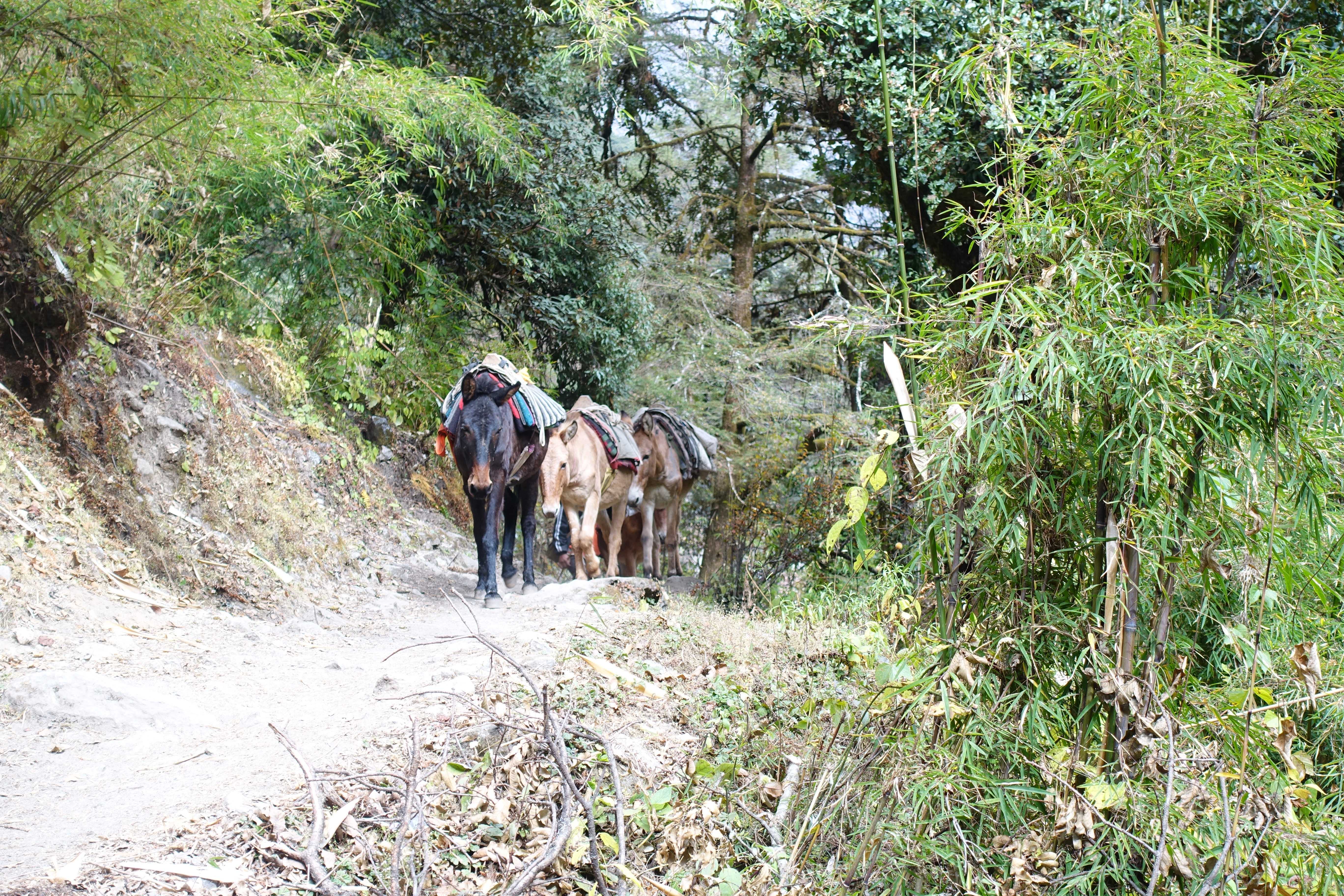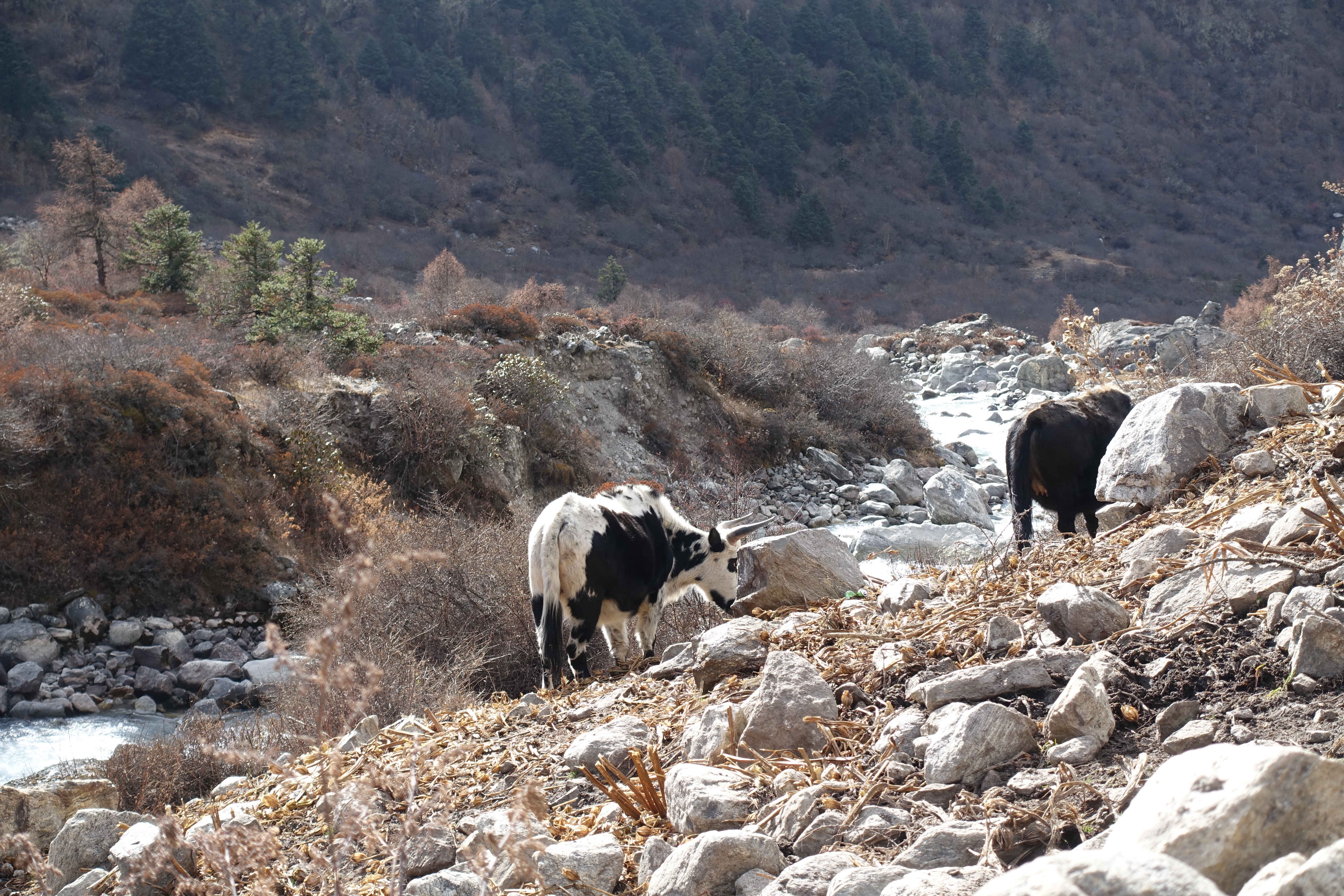 Dogs. Cats who looked cute but were evil, cows, yaks, naks (crossing between cows and yaks, ‘not yaks’), buffalos, white-faced monkeys, musk deer (who get hunted because of the smell of their navel goes well in musk perfume), all kinds of birds (Himalayan monals, pheasants, woodpeckers, etc.), tame goats, mountain goats, bees, butterflies, mules, horses, lizards, chickens/hens, grasshoppers, crickets, other humans.