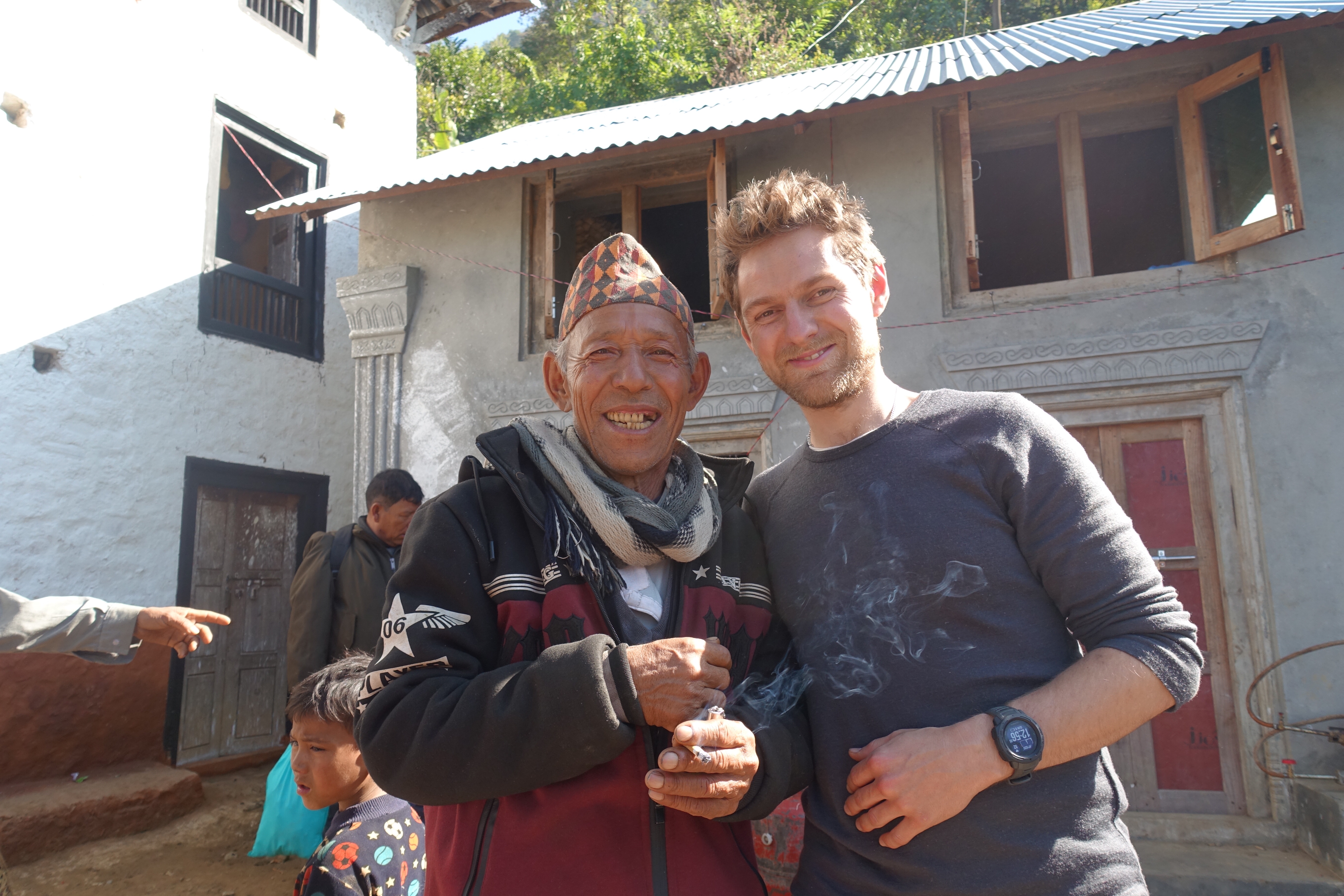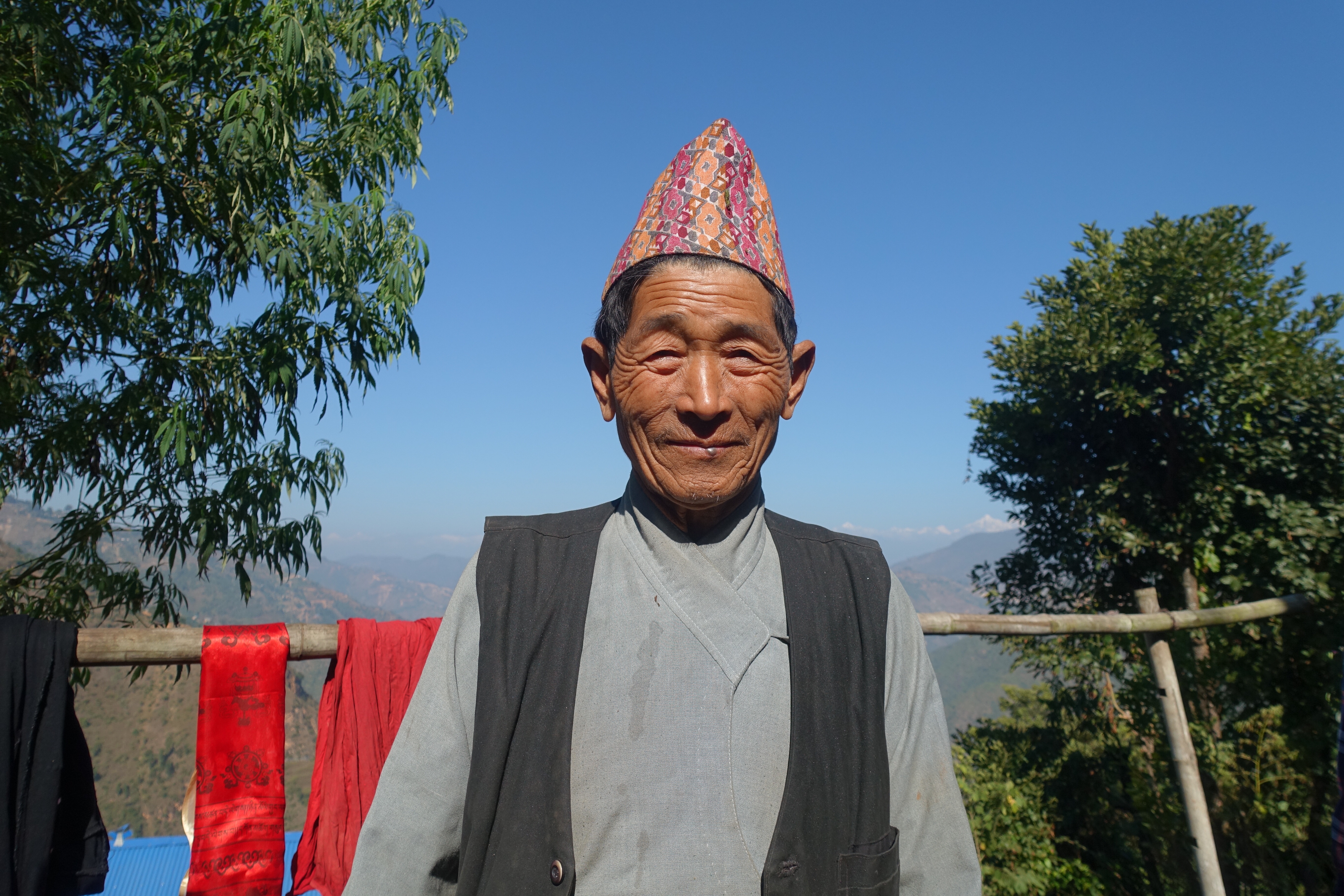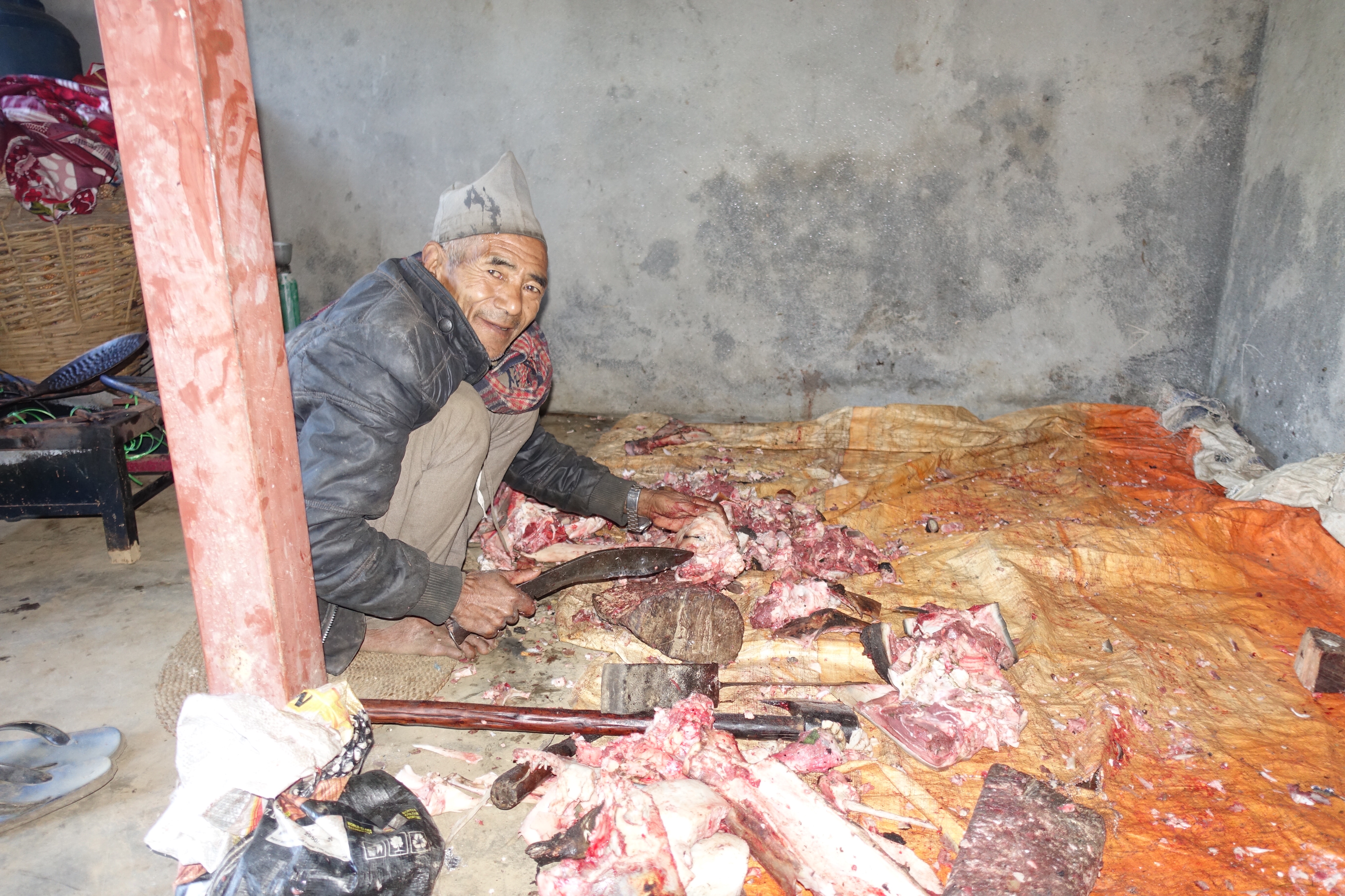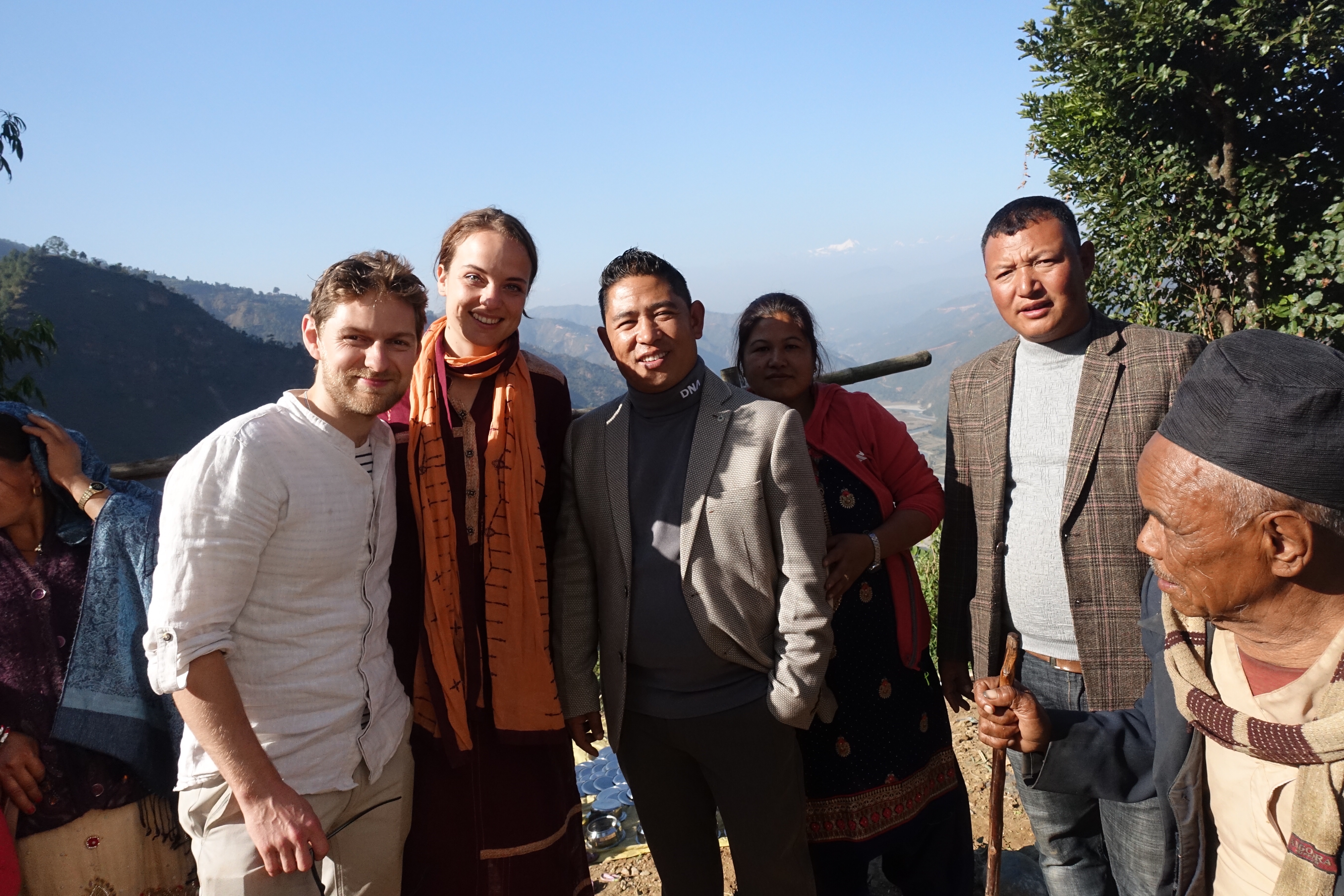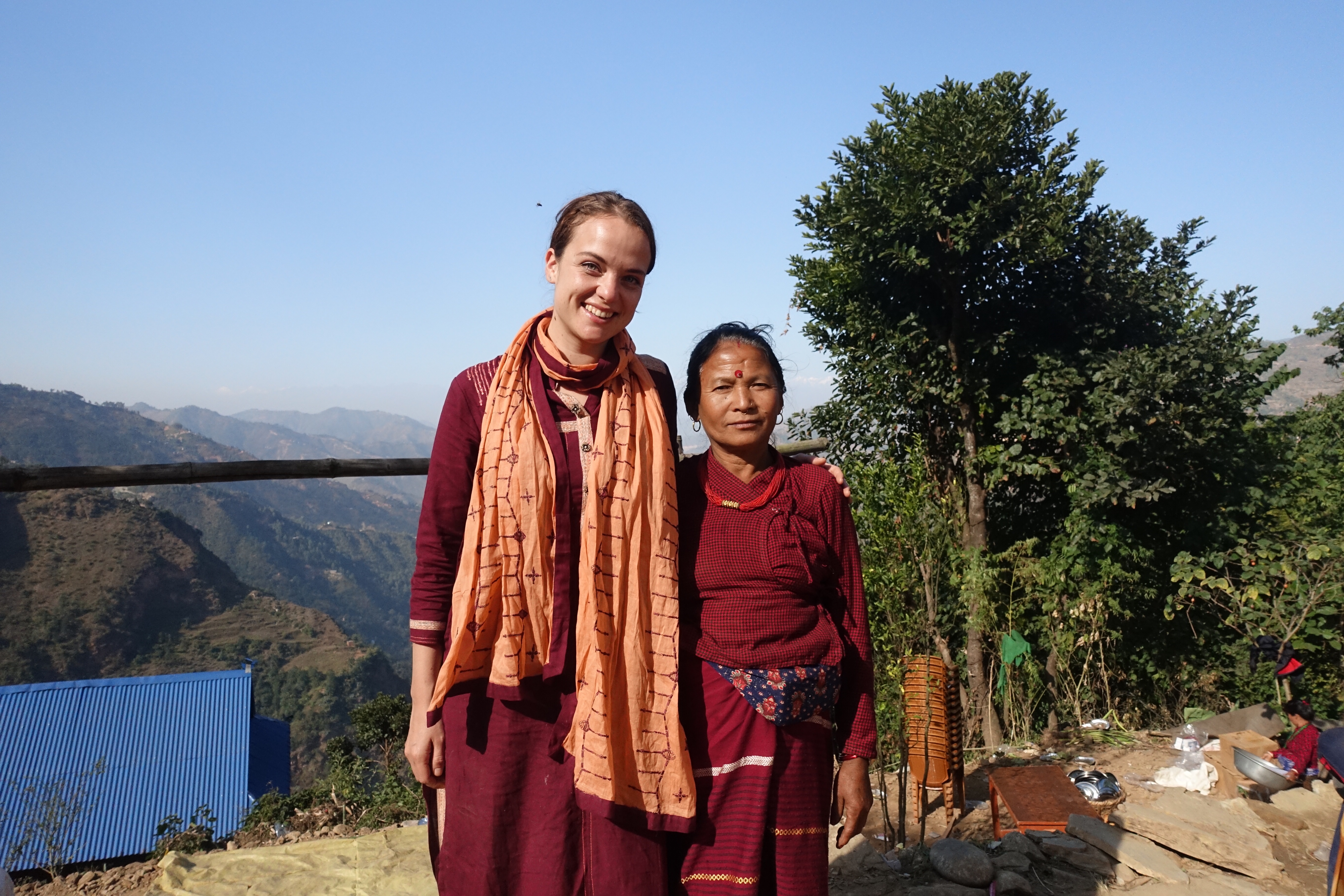 The wedding was of the 30 year old daughter of the previously mentioned Guru. We got invited by the older brother of the bride, who we initially sat down with to learn more about Maruni Shamanism. He became a friend, and offered us a walnut as a symbolical gesture of the invitation. After having spent a few days in the home of Jwala, his cousin-brother, we set off by jeep to the unknown – we were briefly told what to expect but it was hard for us to visualise it. We got crammed in a nice private jeep (travelling Nepali style), and while I dozed off on my motion sickness tablets, Pete’s imagination was running wild (see Pete’s blog below). After a bumpy 5 hour ride, we reached Kuduwal. A few hundred people live in Kuduwal, a village consisting of several stone houses all surrounded by roaming buffalos, goats and chickens, scattered over a piece fo the mountain. The house of the brides’ parents gives a breathtaking view of the river valley that lies below with a background of some majestic Himalayan mountain ranges with snowy peaks. We pitched a few tents on their land, in which we slept for the nights to come. Every day rewarded with a magical view. The houses in the village are very basic. There is little to no furniture, other than a few woven mats, wooden beds and no showers. There is limited supply of water as the village’s water tank needs to be filled up manually. We didn’t experience any shortage of water, though.